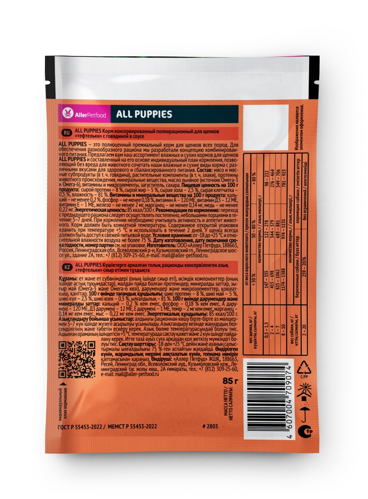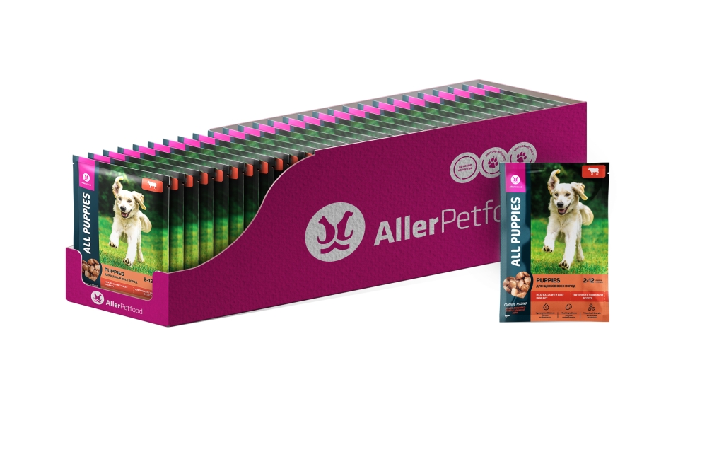 Влажные корма ALL PUPPIES производят из высококачественных ингредиентов, не содержат ГМО, сои и вредных красителей. Продукт производится на предприятии, сертифицированном по стандартам ISO 22 000, используемых при производстве продуктов питания для людей.