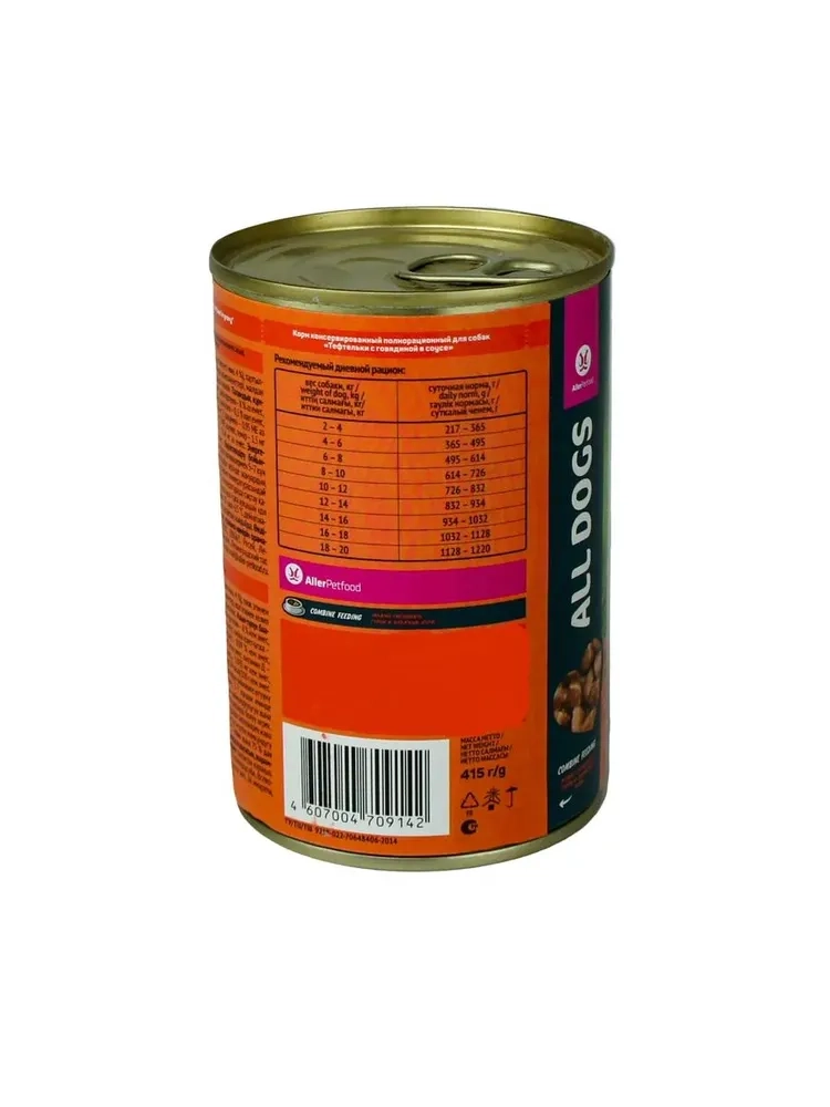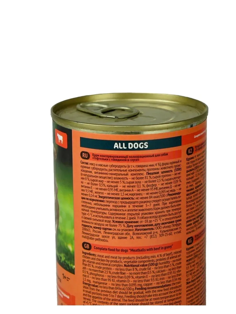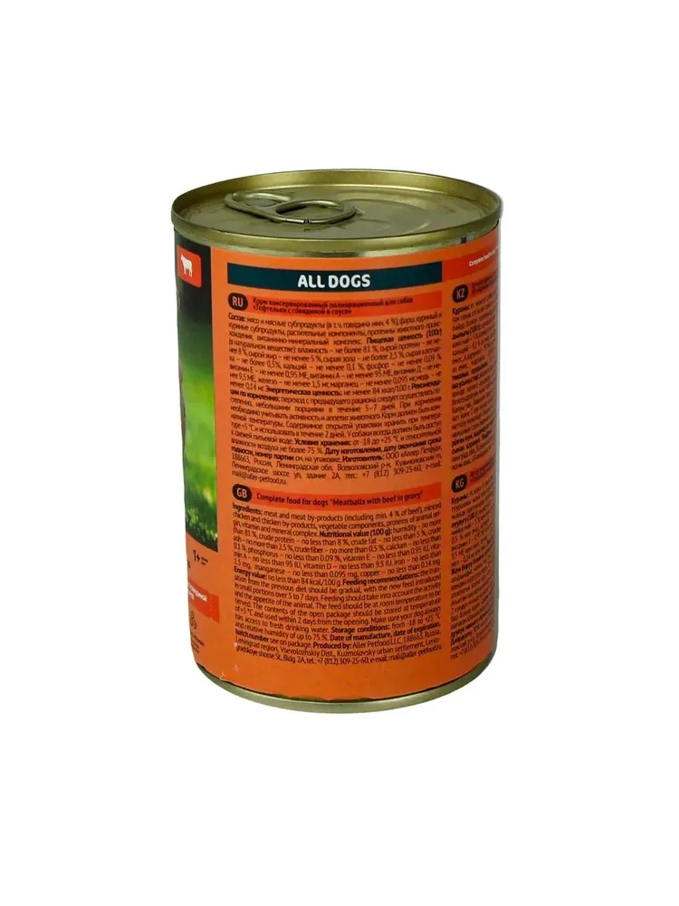 Корм консервированный полнорационный для собак «Тефтельки с говядиной в соусе». Консервированный премиальный корм ALL DOGS для собак подходит для кормления собак всех пород. Он разработан на основе результатов последних исследований в области питания домашних животных, а также с учетом международных стандартов (AAFCO/FEDIAF). ALL DOGS идеально подходит в качестве полноценного питания, поскольку содержит жизненно важные витамины и минералы. ALL DOGS производится из высококачественных ингредиентов, не содержит ГМО, сои и вредных красителей. Продукт производится на предприятии, сертифицированном по стандартам ISO 22 000, используемых при производстве продуктов питания для людей. Корм можно использовать как в чистом виде, так и смешивая его с сухими кормами линейки ALL DOGS. Рекомендации указаны на упаковке. ALL DOGS – Ваше спокойствие в выборе!