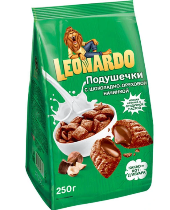 Готовый завтрак LEONARDO подушечки с шоколадно-ореховой начинкой 250 г