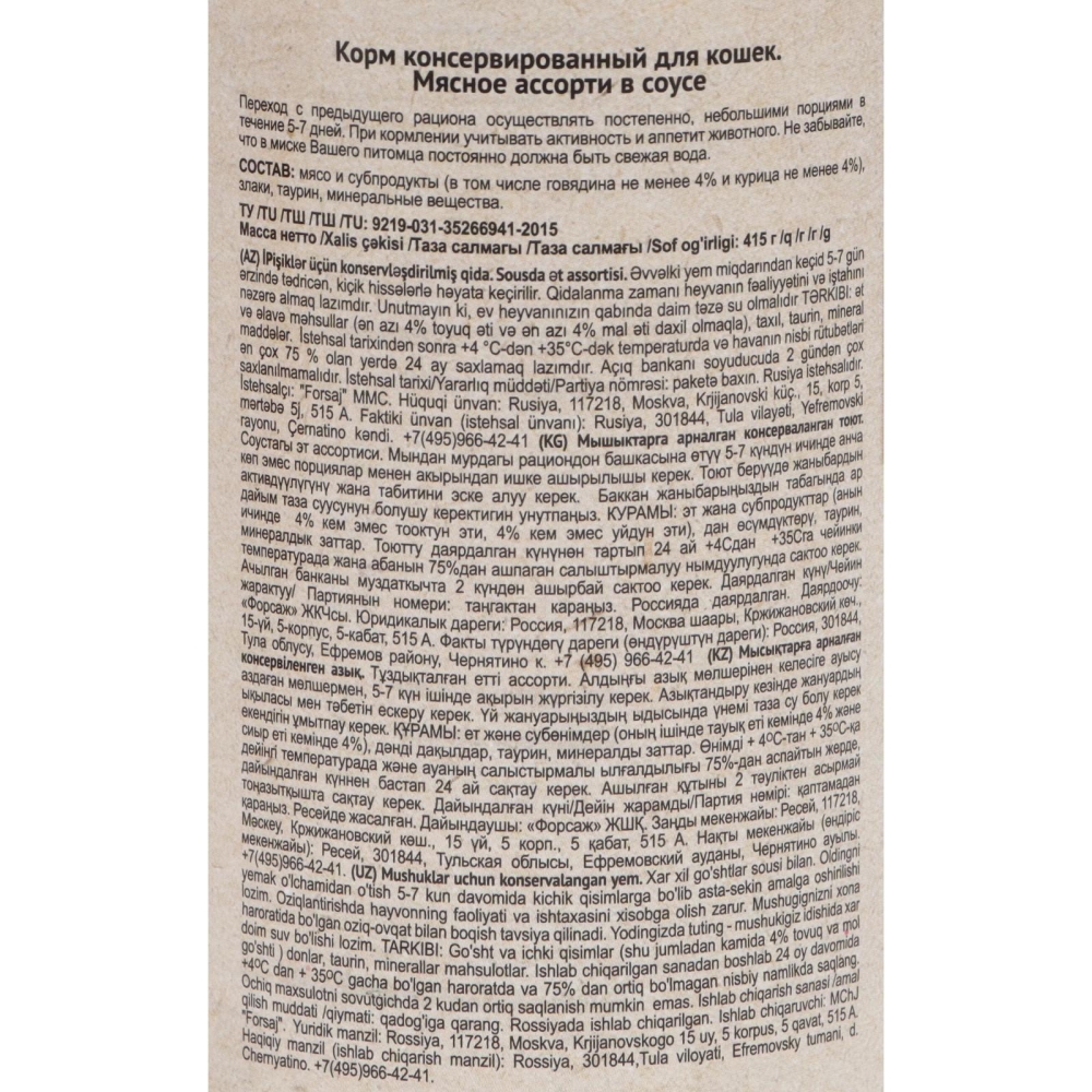 Влажный корм для кошек содержит: мясо и субпродукты (в том числе говядина не менее 4%, курица не менее 4%), злаки, таурин, минеральные вещества.