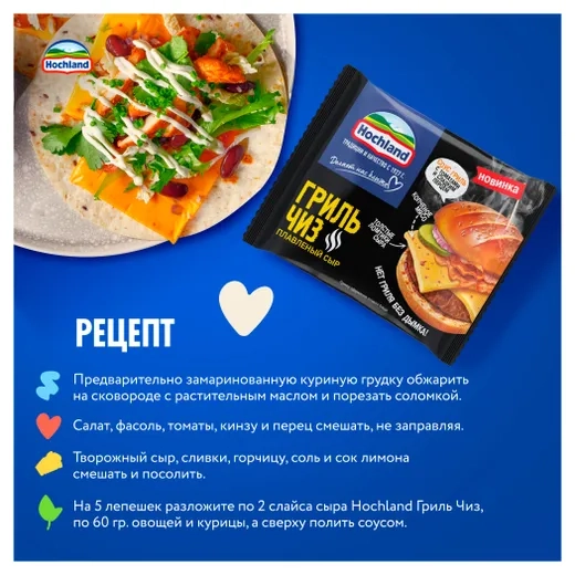 Плавленый сыр Hochland «Гриль Чиз» идеально подойдет для приготовления бутербродов и бургеров. Он отлично сочетается с мясом, курицей, зеленью, овощами, майонезом или соусом барбекю. Квадратный толстый ломтик сыра «Гриль Чиз» удобно помещается на хрустящем пшеничном тосте или сдобной булочке с кунжутом.