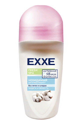 Женский дезодорант антиперспирант EXXE Fresh SPA Невидимый, 50 мл (ролик). Мягкая и эффективная формула антиперспиранта эффективно устраняет запах пота и не раздражает даже самую чувствительную кожу. Не оставляет следов на одежде. В течение всего дня Вы сможете наслаждаться ощущением чистоты и свежести. Активные компоненты, работающие против потоотделения (соли алюминия и цинка), действуют по принципу блокировки влаги. Дезодорирующие компоненты обеспечивают приятный аромат. Антибактериальные компоненты препятствуют размножению бактерий и дополнительно нейтрализуют неприятный запах пота. Формула антиперспиранта, обогащенная глицерином, увлажняет кожу.
