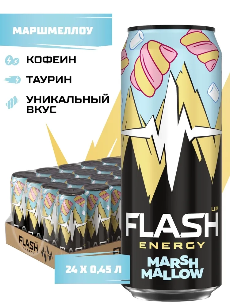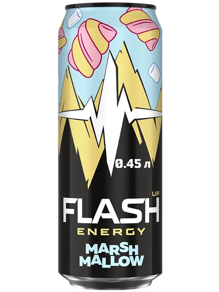 Энергетик Flash Up Energy Marshmallow Flash Up Energy Marshmallow — безалкогольный энергетический напиток с уникальным вкусом мягкой ванильной сладости для тех, кто любит необычные сочетания. Содержит кофеин, таурин и комплекс витаминов.