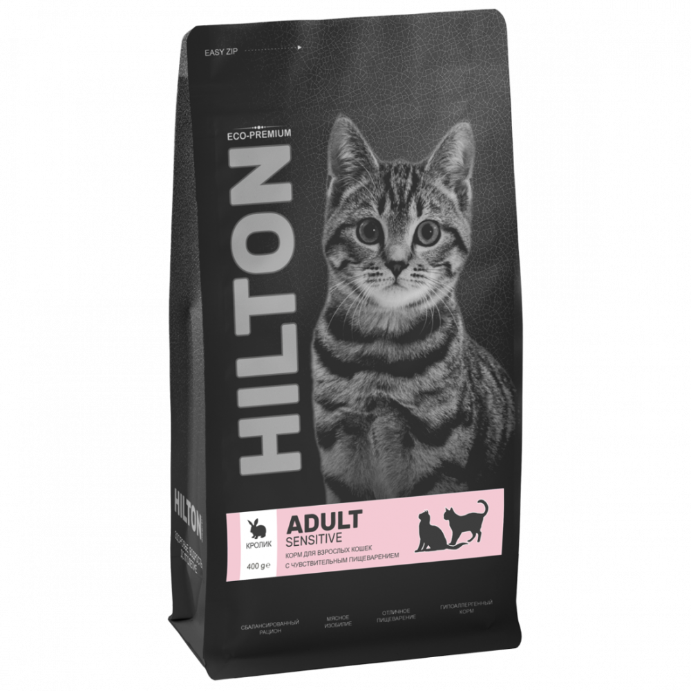 HILTON Кролик — это специальный сухой корм для кошек, разработанный с учетом потребностей животных с чувствительным пищеварением.Предлагаем новый вкус - с мясом кролика.
