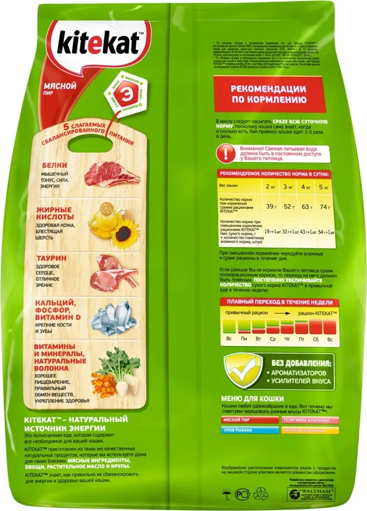 KITEKAT™ «Мясной пир» — полноценное питание для кошек на каждый день. Состав корма разработан профессионалами: в нём содержатся белки, жиры, а также незаменимые витамины (D3, B5, B6 и др.), минералы (кальций, фосфор, магний и др.), полезные жиры, масла и таурин в правильной пропорции. Благодаря клетчатке корм хорошо усваивается, поддерживая здоровье пищеварительной системы, а за счёт своей сбалансированности он подойдёт и стерилизованным питомцам. Для оптимального контроля веса питомца и заботы о здоровье ротовой полости и мочевыводящей системы рекомендуется сочетать сухой корм с влажными рационами KITEKAT™. Качество корма KITEKAT™ проверено временем — это источник жизненных сил и энергии для многих поколений кошек!