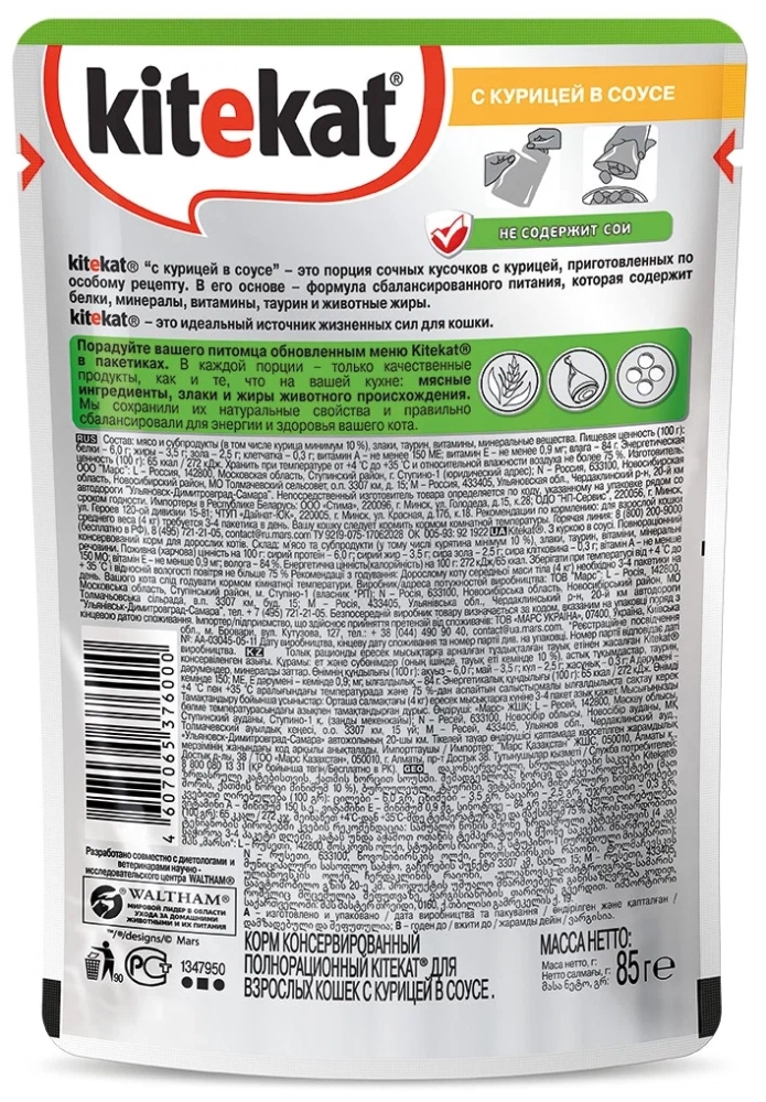 KITEKAT™ «Аппетитная курочка в соусе» — полноценное питание для кошек на каждый день. Текстура соуса придаёт особенно сочный вкус кусочкам курочки. Корм KITEKAT™ создан из высококачественных ингредиентов и содержит все необходимые для здоровья питомца полезные элементы — белки, жиры, витамины (D3, B5, B6, и др.), минералы (кальций, фосфор, магний и др.), таурин, полезные жиры и масла — в правильном соотношении, подобранном профессионалами. За счёт клетчатки корм поддерживает здоровье пищеварительной системы, а благодаря сбалансированному составу — подходит и для стерилизованных кошек. Для оптимального контроля веса питомца и заботы о здоровье его ротовой полости рекомендуется сочетать влажный корм с сухими рационами KITEKAT™. Качество KITEKAT™ проверено временем — это источник жизненных сил и энергии для многих поколений кошек!