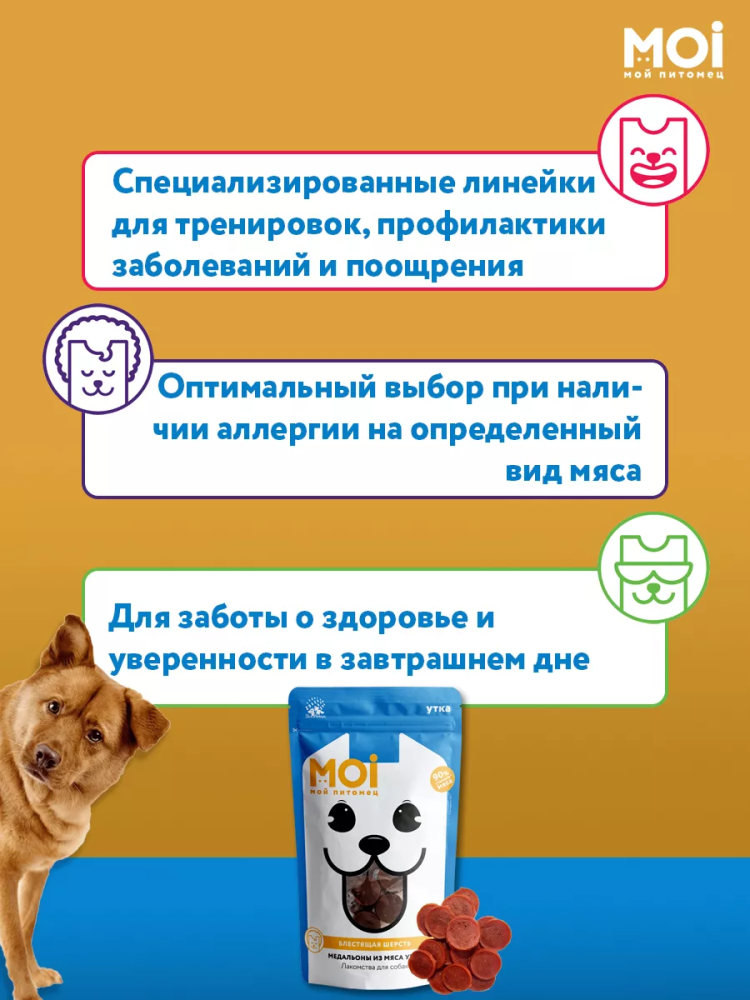 Лакомства Moi все, чтобы питомец был счастлив! Аппетитные медальоны из мяса утки - настоящее мясное наслаждение. Состав на 90% состоит из натурального утиного мяса, медальоны идеально подходят для поощрения питомца. Это несомненно не просто вкусное, но еще и полезное дополнение к постоянному рациону питомца.