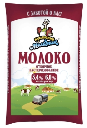 Молоко КУБАНСКИЙ МОЛОЧНИК пастеризованное цельное отборное 3,4-6,0% 900 мл пленка