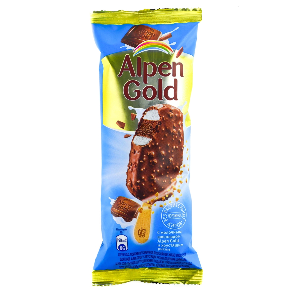 Мороженое ALPEN GOLD сливочное двухслойное с какао в молочном шоколаде с хрустящим рисом и солеными шариками 58 г