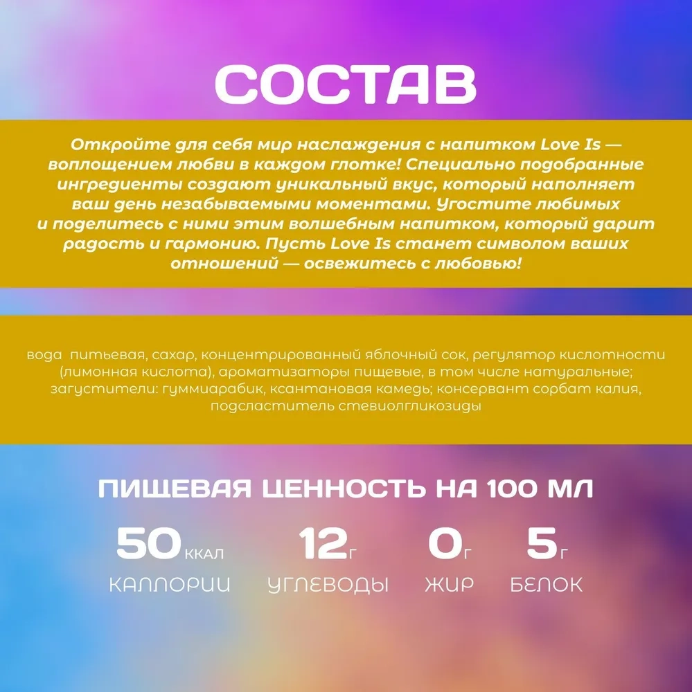 Каждая бутылка — это не просто напиток, а источник положительных эмоций и радости. Сочетание различных ягод создаёт гармоничное послевкусие, которое удовлетворит даже самых искушённых ценителей газированных напитков. С Love Is "Ягодный микс" вы сможете насладиться яркостью ягод и легкостью газа в каждом глотке.