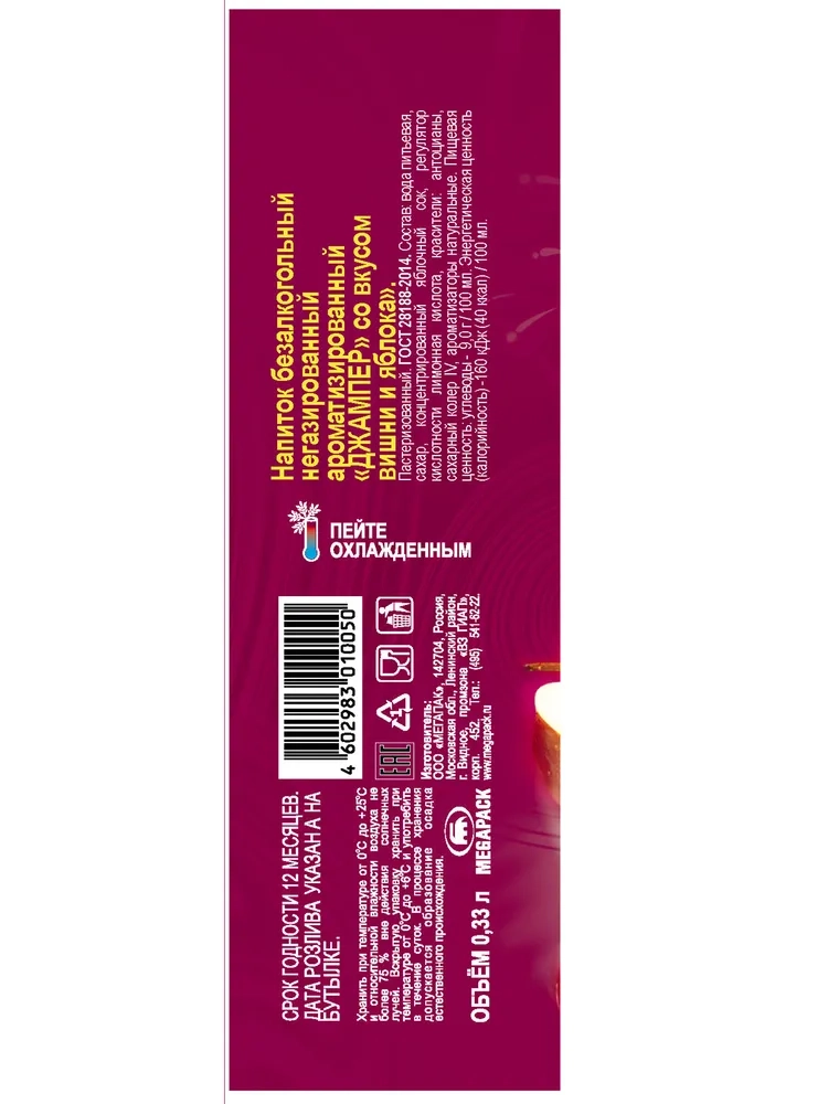 вода питьевая, сахар, концентрированный яблочный сок, регулятор кислотности лимонная кислота, красители: антоцианы, сахарный колер IV, ароматизаторы натуральные. В процессе хранения допускается образование осадка естественного происхождения.