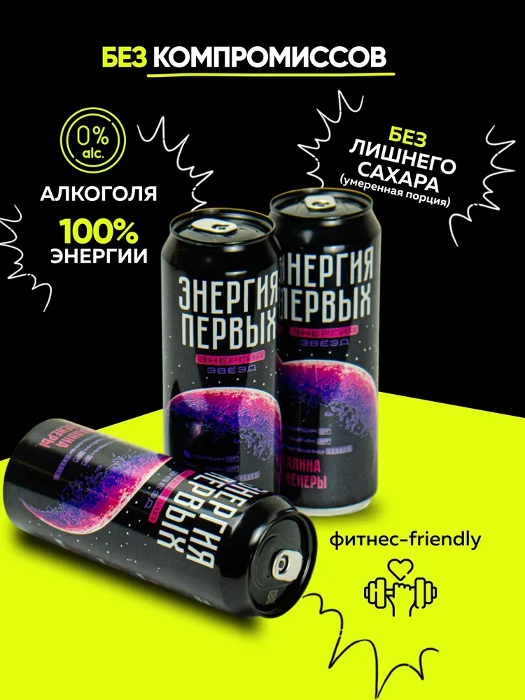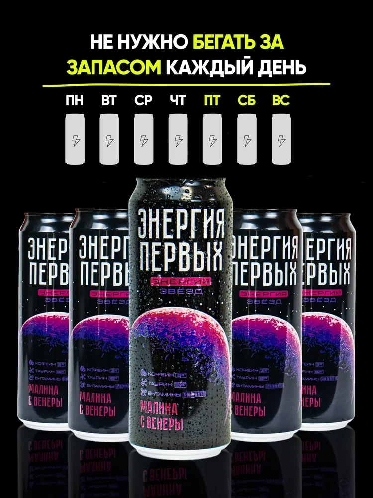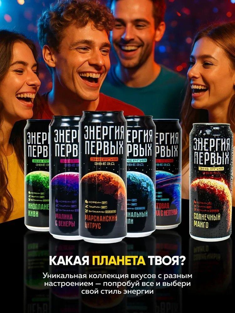 Представляем вам тонизирующий напиток «Энергия первых», который заряжает с первого глотка! Производитель сфокусировался на вкусовых качествах энергетика, переосмыслив классику и создав по — настоящему запоминающиеся новые космические сочетания!