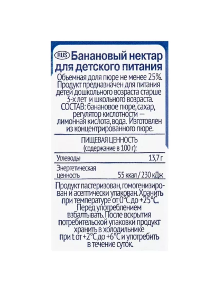 Состав: вода, банановое пюре, сахар, регулятор кислотности-лимонная кислота, антиокислитель-аскорбиновая кислота. Изготовлено из концентрированного пюре.