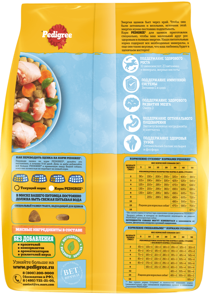 Он состоит из качественных и натуральных ингредиентов: мяса, овощей, злаков. Поэтому PEDIGREE® полнорационный корм с курицей способствует здоровому росту и гармоничному развитию вашего малыша.