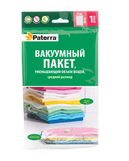 Вакуумный пакет "Paterra", выполненный из плотного полиэтилентерефталата и полипропилена, предназначен для компактного хранения и перевозки одежды, постельных принадлежностей, мягких игрушек и прочего. Обеспечивает герметичную защиту вещей от влаги, пыли, моли и запаха. Пакет оснащен удобным клапаном и застежкой. Возможно многократное использование пакета. Работает от пылесоса.