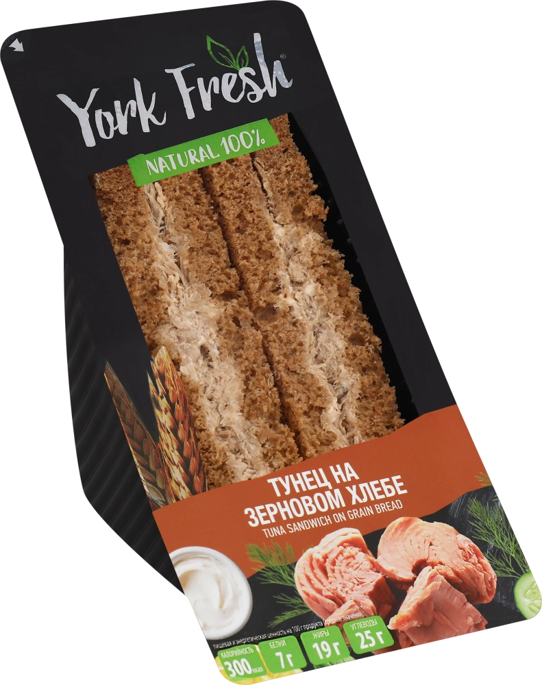 Сэндвич YORK FRESH с тунцом на зерновом хлебе – отличный вариант сытного перекуса. Превосходное сочетание ароматного хлеба и начинки из рыбного филе с нежным творожным сыром подарит вам истинное наслаждения. Благодаря специальной упаковке-контейнеру свежесть и великолепный вкус продукта сохраняются надолго. Использование передовых технологий производства на основе современного европейского оборудования обеспечивает качество, исключительный вкус и питательные свойства продукта.