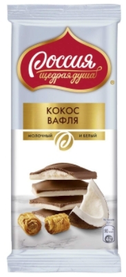 Шоколад РОССИЯ - ЩЕДРАЯ ДУША молочный и белый с кокосом и вафлей 82 г