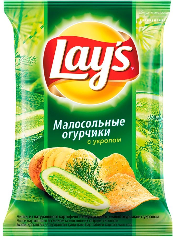 Состав: картофель, растительное масло, идентичный натуральному ароматизатор Малосольные огурчики с укропом (лактоза (из молока), соль, глюкоза, натуральные вкусоароматические вещества, усилители вкуса и аромата (глутамат натрия, гуанилат натрия, инозинат натрия), порошок молочной сыворотки, специи, сухое обезжиренное молоко, регулятор кислотности (лимонная кислота).