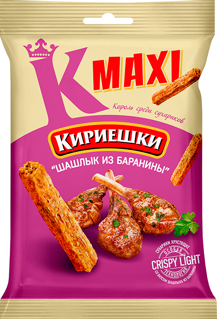 Низкокалорийные хрустящие сухарики со вкусом шашлыка из баранины. «Кириешки Maxi» – сухарики нового поколения, изготовленные по уникальной технологии «Сrispy Light», обеспечивающей хруст и легкость. В основе сухариков кукурузная мука, сбалансированная по составу жиров, белков, углеводов и обогащенная клетчаткой.