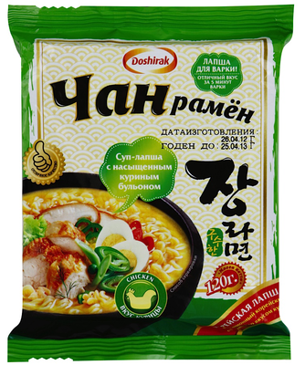 Корейская еда включает десятки тысяч рецептов и в большей их части обязательно используются китайские продукты, такие как рисовая лапша, фунчоза, японская лапша и макаронные изделия. Бакалея каждого магазина имеет полку - лапша корейская. Именно Доширак лапша быстрого приготовления впервые погрузила наши вкусы в азиатскую культуру и по сей день остается основным представителем которому мы доверяем. Ассортимент продукции Доширак это не только китайская лапша быстрого приготовления! Тайские продукты а особенно соусы и сычуаньский перец нашли свое место в Мёных и Раменах. Залил кипятком добавил специй, соус и вуаля корейская лапша готова! Рамен корейский именно так в Кореи называется лапша имеющая особый вкус и аромат. Китайская лапша это обязательно острая лапша с различными вкусами. Остря еда является характерной для азиатской культуры. Лапша быстрого приготовления является незаменимым продуктов в повседневной жизни, так как данная лапша приготовлятеся очень быстро , что позволяет вам сэкономить много времени. Также эту лапшу удобно брать с собой на работу в офис или на прогулку , чтобы утолить голод. Попробуйте лапшу Чан Рамен и ощущает незабываемый вкус азиатской кухни!