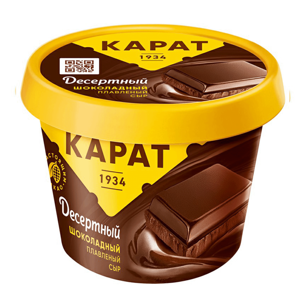 Десертный шоколадный сыр «Карат» — плавленый сыр из несоленых сортов твердого сыра с добавлением свежего творога, сливочного масла и настоящего какао, именно поэтому десертный сыр получается с нежным и насыщенным шоколадным вкусом. Десертный шоколадный – идеальная пара и к выпечке и блинчикам на завтрак, и десерт для сладкого перекуса с чаем или кофе. Завод «Карат» входит в тройку крупнейших производителей плавленого сыра страны. Шоколадный плавленый сыр производится с 1964 года. Секрет успеха заключается в неизменном высоком качестве — все продукты бренда производятся из отборных ингредиентов и проходят тщательный контроль на каждом этапе. Десертный шоколадный сыр «Карат» идеально подходит для блинчиков, оладьев и панкейков, для приготовления выпечки со сладкими начинками. Если захотелось сладкого на завтрак, намажьте десертный шоколадный сыр на круассан или ломтик белого хлеба. Можно добавить свежие ягоды или сезонные фрукты. Для семейного чаепития и для перекуса с чашкой кофе попробуйте приготовить конвертики из слоеного теста с шоколадной начинкой: подготовьте слоеное тесто, раскатайте и разрежьте на квадратики. В середину каждого квадратика положите ложку Десертного шоколадного сыра, защипните края, сформируйте конвертики. Смажьте яйцом и выпекайте в духовке до готовности. Десертный сыр «Карат» — большое сырное удовольствие!