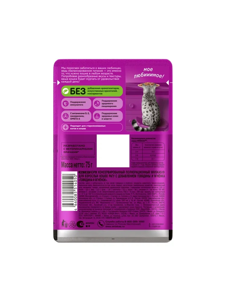 Это сбалансированный рацион, приготовленный так, как любит ваша кошка. Аппетитное рагу с говядиной и ягненком в густом соусе обязательно понравится вашей любимице. Жизнь замуррчательна, ведь Whiskas® содержит все необходимое, чтобы еда вашей кошки была не только вкусной, но и полезной. Whiskas® поддержит иммунитет, позаботится о здоровом пищеварении и здоровье кожи и шерсти вашей кошки. Подходит для стерилизованных котов и кошек.