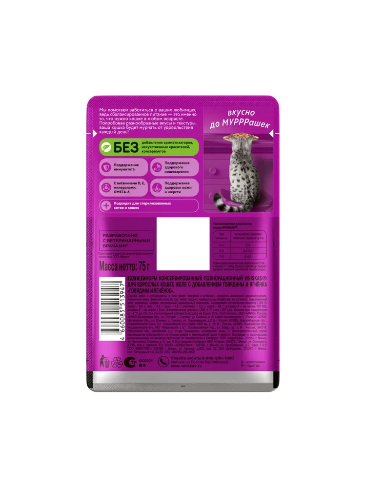 Это сбалансированный рацион, приготовленный именно так, как любит ваша кошка. Отборные мясные кусочки с говядиной и ягненком в аппетитном желе придутся по вкусу вашей любимице. Жизнь замурррчательна, ведь Whiskas® содержит все необходимое, чтобы еда вашей кошки была не только вкусной, но и полезной. Whiskas® поддержит иммунитет, позаботится о здоровом пищеварении и здоровье кожи и шерсти вашей кошки. Подходит для стерилизованных котов и кошек.