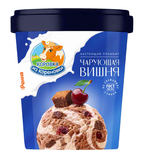Мороженое КОРОВКА ИЗ КОРЕНОВКИ "Чарующая вишня" пломбир шоколадный с вишней и крошкой шоколадного печенья 300 г 15%